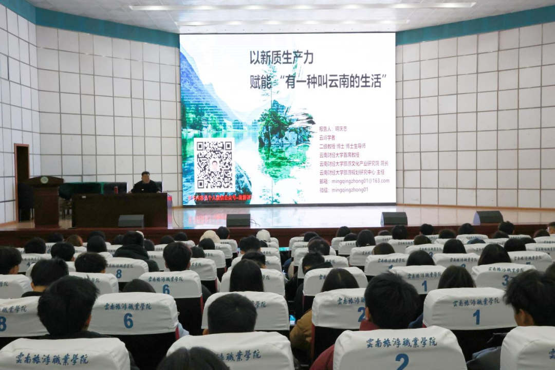 讲座中,明庆忠教授以“以新质生产力赋能‘有一种叫云南的生活’”为主题,从文旅新质生产力的内涵与逻辑——缘何文旅业需要发展新质生产力、文旅新质生产力的内涵;文旅新质生产力基本要求与赋能 “有一种叫云南的生活”的契合,文旅新质生产力赋能 “有一种叫云南的生活”等方面作了讲解。明教授还聚焦云南实际,通过大量具体案例,围绕打造文旅产业升级版,培育“有一种叫云南的生活”品牌,实现丰富多样的消费新场景新增长点开展深入浅出的讲解。近两小时的讲座内容详实,内涵丰富。
