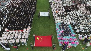在嘹亮的国歌声中,鲜艳的五星红旗冉冉升起。全体行注目礼,高唱国歌,共同祝福我们的祖国永远美丽、富强,运动会正式开始!