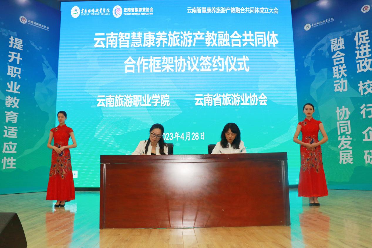 成立大会在bevictor伟德国际1946官网师生优美的艺术展演中拉开帷幕。bevictor伟德国际1946官网与云南省旅游业协会签署合作框架协议,隆重举行云南智慧康养旅游产教融合共同体揭牌仪式。